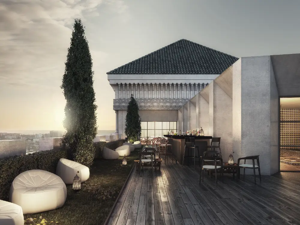 Dans la continuité des efforts du groupe REALITES pour la réhabilitation de la façade, nous avons choisi des matériaux locaux traditionnels, mettant à l’honneur les matières naturelles (comme terre cuite, travail du bois, terrazzo, zelliges, etc.) et leur réinterprétation contemporaine alliée au confort apporté par les technologies actuelles.